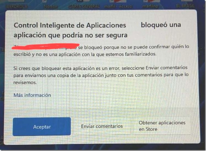 Empezamos la mañana con un correo de un cliente donde nos pega una imagen como la que va arriba. En la parte roja tachada figura el nombre de un programa de contabilidad creado por una empresa del pueblo. Nuestro cliente tiene ese programa desde hace décadas y además lo usa en otros dos PCs. Pues hoy al arrancar Windows 11 ha decidido que ese programa no era de fiar, pero en los otros PCs si era de fiar.
