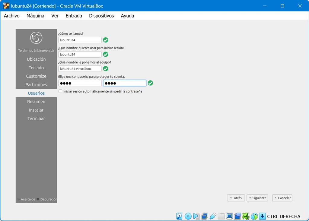 Ahora hay que poner los datos del usuario y la contraseña de arranque: