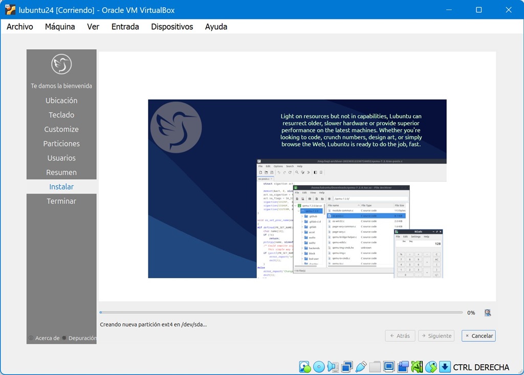 Ahora hay que pulsar el botón de abajo a la derecha que pone “Install Lubuntu” si queremos instalarlo y empezará con la instalación, que es muy parecida a la de Ubuntu: