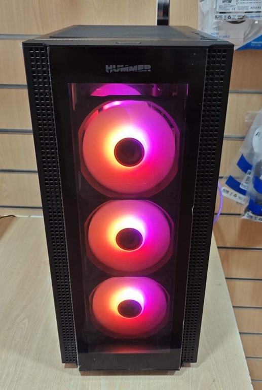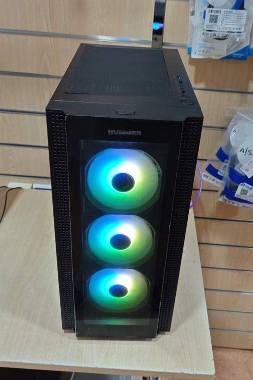 Como casi siempre empezamos por la caja. Le mostramos cajas con leds de modelos que nos gustan por tener buena ventilación, venir con los ventiladores con leds ya montados de fábrica (si, hay muchas cajas que ves la foto, es preciosa… pero hay una nota en letra minúscula abajo del todo que dice: ventiladores no incluidos) y donde cupiese bien un equipo de gama media. Al cliente le gusto la Nox Hummer Horus en Negro: