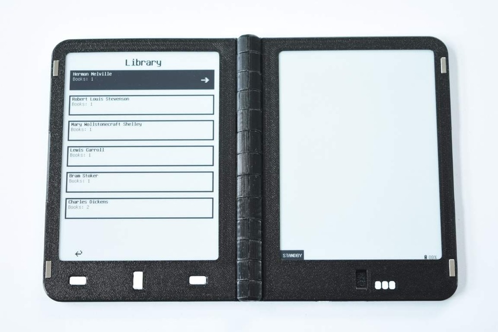 En Hackaday.io muestran un diseño de lector de libros el Diptyx ereader que como se puede ver en la imagen superior destaca por un diseño con doble pantalla que simula el aspecto de un típico libro en papel abierto. Ahora que tenemos la moda de los móviles con doble o triple pantalla, las tabletas y los portátiles… esta revisión simple del lector de libros para ponerle dos pantallas me gusta mucho.